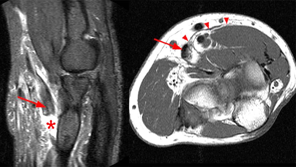 L’examen clinique montre une perte de force en supination, un tendon absent à la palpation et la perte de force en supination par rapport au côté opposé.